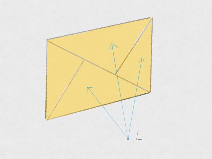 지오메트리의 가시 각도(visible angle) 알파는 리스너의 관점에서 지오메트리가 보이는 각도입니다. 주요 레이의 개수에 따라 두 레이 간 평균 각도(감마)는 달라질 수 있습니다. 알파와 감마 간 관계는 오브젝트와의 교차점(반사나 회절)을 찾아낼 수 있는 확률에 영향을 끼칩니다. 만약 감마가 알파보다 작을 경우, 교차점을 찾을 수 있는 확률은 높아집니다. 만약 감마가 알파보다 클 경우, 교차점을 찾을 수 있는 확률은 낮아집니다.