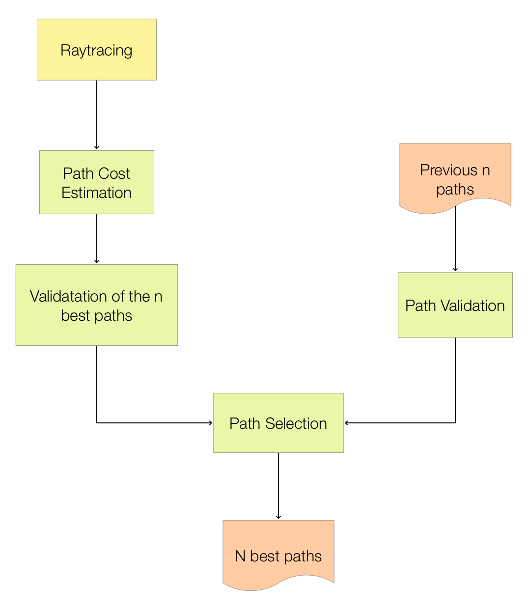 In the first phase, path sorting estimates the cost (length and diffraction) of each potential reflection path based on the results of the raytracing. The paths are then processed in ascending order until a maximum of n (the user-specified number of reflection paths) paths are validated. To reduce flickering (switching between paths), the previous paths are also validated. In the second phase, the best n paths are selected from the current and previous validated paths based on their final real costs.