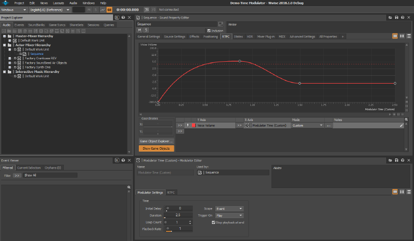 Time is a new modulator that is used alongside RTPC curves to create property automation over time. By attaching the Time modulator to any RTPC-able property, you can easily create complex volume envelopes, pitch ramps, filter modulations, or any other creative applications that may require variations over time.