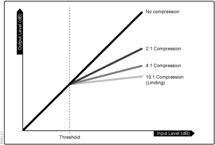 비율은 입력이 한계점을 초과할 때의 동적 압축(dynamic compression) 정도를 결정합니다. 예를 들어 비율이 4일 경우 입력 신호가 한계점을 4 dB만큼 초과할 때마다 출력 신호에는 1 dB씩만 나타내는 식입니다.