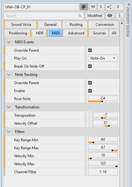 The MIDI category contains MIDI properties of the selected object.