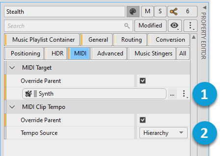 The MIDI category for music objects allows you to specify the target and tempo of the MIDI content of an object. The target can be any playable object in the Containers hierarchy. 템포는 Interactive Music 오브젝트에 들어 있는 모든 미디 콘텐츠에 전역적인(global) 값으로 지정해도 되고 미디 파일에서 가져와도 됩니다.