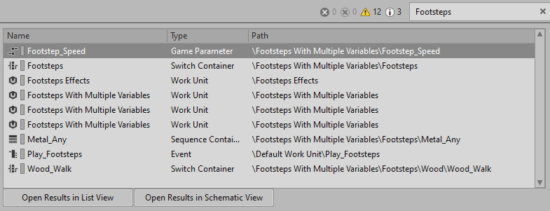 Wwise 툴바에서 Search 입력란에 프로젝트 요소의 Name, Notes, 또는 그 일부를 입력합니다. (Wwise의 아무 곳에서 Ctrl+Shift+F를 누르면 키보드 포커스가 Search 입력란으로 이동합니다.)