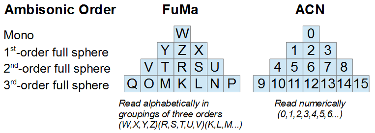 앰비소닉에 사용하는 요소 차수법의 두 가지 주요 포맷은 흔히 FuMa 차수법이라고 불리는 퍼스 맬햄(Furse-Malham)과 흔히 ACN 차수법이라고 불리는 앰비소닉 채널 개수(Ambisonics Channel Number)입니다. 다음 그림에서 볼 수 있듯이 FuMa는 각 그룹마다 알파벳순으로 글자를 사용하여 표기합니다. 이 차수법은 먼저 W (옴니) 채널에서 시작하여 오른쪽 아래, 왼쪽 아래, 아래쪽 중심 순으로 이동하고, 그 다음 순서로 이동하여 R에서부터 오른쪽, 왼쪽, 그 다음 오른쪽, 그 다음 왼쪽 순으로 이동하고, 그 다음 순서로 이동하여 비슷한 패턴을 따라서 이동하는 식으로 표기합니다. 반면에, ACN 차수법은 숫자를 사용하며 왼쪽에서 오른쪽 순서로 따르기가 훨씬 쉽습니다.