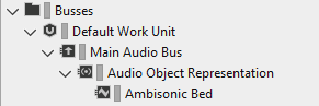 최상위 오디오 버스는 반드시 Audio Object를 사용하도록 설정되어야 하지만 베드에 대한 하위 앰비소닉 버스를 만들어 사운드의 앰비소닉 다운믹스가 라우팅되도록 강제 설정할 수 있습니다. 상위 버스로 직접 라우팅된 사운드는 Audio Object로 취급됩니다. 앰비소닉 베드는 단일 다채널 오브젝트로도 취급됩니다.