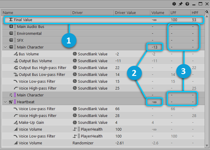 RTPC: RTPC로 인한 변화는 Game Parameter와 함께 Driver로 나타나며 현재 매개 변수의 값이 Driver Value 열에 열거됩니다. The corresponding change, once the RTPC curve transforms the value, appears in the Volume, LPF, HPF, or DSF column.