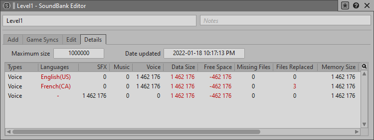 SoundBank가 Sound Voice 오브젝트를 담고 있을 경우 Details 탭의 정보가 언어별로 정리됩니다. 또한 Wwise는 잠재적인 문제를 빠르게 식별하도록 도와주는 일부 정보를 빨간색으로 표시합니다.