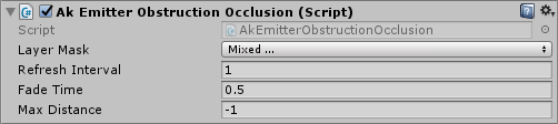 Unity에서 GameObject에 AkEmitterObstructionOcclusion 컴포넌트를 추가하면 방사체를 방해하거나 차단할 수 있습니다. 방사체와 리스너 사이의 경로에 오브젝트가 있을 경우 해당 컴포넌트가 방해/차단 값을 1로 SetObjectObstructionAndOcclusion()을 호출합니다. 맵이 공간 음향을 사용하지 않을 경우 (AkRoom 컴포넌트가 없을 경우) AkEmitterObstructionOcclusion 컴포넌트가 차단을 사용하게 됩니다. 공간 음향 씬에서는 이와 동일한 컴포넌트가 공간 음향 리스너에만 방해를 사용합니다. 이 공간 음향 리스너는 AkSpatialAudioListener 컴포넌트를 가진 GameObject를 말합니다. 방사체 방해는 공간 음향 리스너와 동일한 공간에 있는 방사체에 적용됩니다.