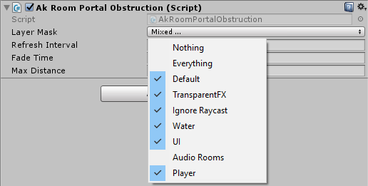 Portal이 연결되는 Room의 메시에 AkRoomPortalObstruction 컴포넌트가 있을 경우 방해가 일어납니다. Surface Reflector를 사용할 경우 이 리플렉터도 포털의 열린 부분을 방해할 수 있습니다. 그렇기 때문에 이 메시와 Surface Reflector를 서로 다른 레이어에 배치하여 AkRoomPortalObstruction 컴포넌트의 Layer Mask에서 제외시켜야 합니다.