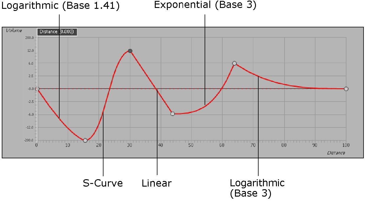 Wwise에서는 부분적인 곡선 형태를 정의할 수 있으므로 곡선을 자유롭게 제어할 수 있습니다. 곡선분은 곡선 내 두 기준점 사이의 부분을 말합니다. 선형, 상수형, 로그형, 지수형, S곡선 등 다양한 모양의 곡선 중에서 하나를 고르시면 됩니다.