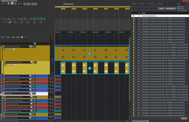 Region/Marker Manager를 사용하면 서로 다른 하위 프로젝트 트랙을 찾아서 이동할 수 있습니다. 더 자세한 정보는 Strata 사용 안내의 구역과 마커를 참고하세요.