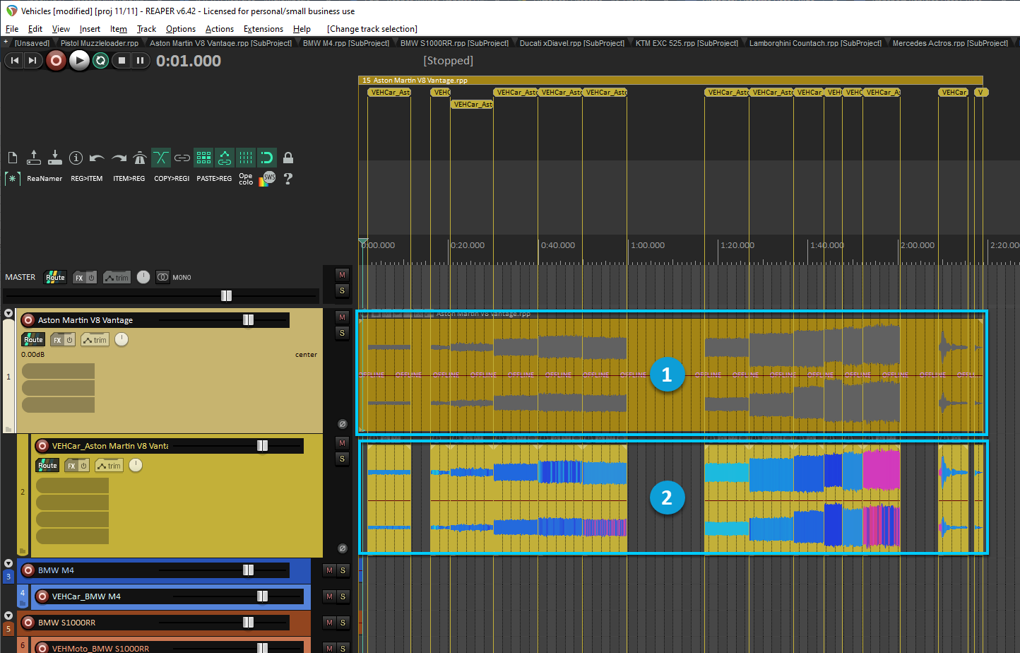 하위 프로젝트 미디어 항목. 이 항목을 더블 클릭하면 (여기서는 Aston Martin V8 Vantage) 하위 프로젝트가 새로운 탭에서 열립니다. |