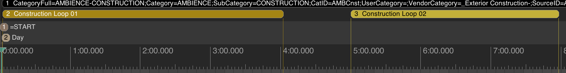 각 반복 재생에 대해 구역이 있으며 해당하는 검정색 Data 구역이 제공됩니다. 하위 프로젝트에 따라 동일한 환경음의 낮과 밤 구역 버전이 하위 프로젝트 디자인의 일부일 수 있습니다.