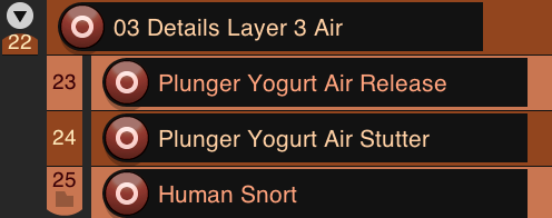 이 Details 레이어는 침이 끈적대거나 목의 깊은 곳에서 나오는 으르릉대는 소리와 같이 생명체 음성에서 가장 가깝고 밀접한 부분을 제공합니다. 근접 시점의 경우 타이밍을 변경해서 전반적인 특성을 변경할 수 있습니다. 모든 Details Layer 3 트랙은 주황색 커스텀 색상을 사용하며, 밝은/어두운 음영을 번갈아 사용합니다.