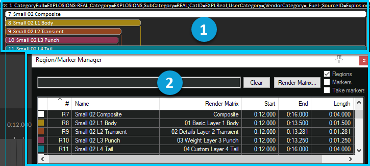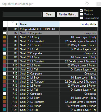 Region/Marker Manager에 표시된 Composite Small Explosion의 구역. 시작 시간, 색상, Render Matrix이 지정된 것을 보세요. |