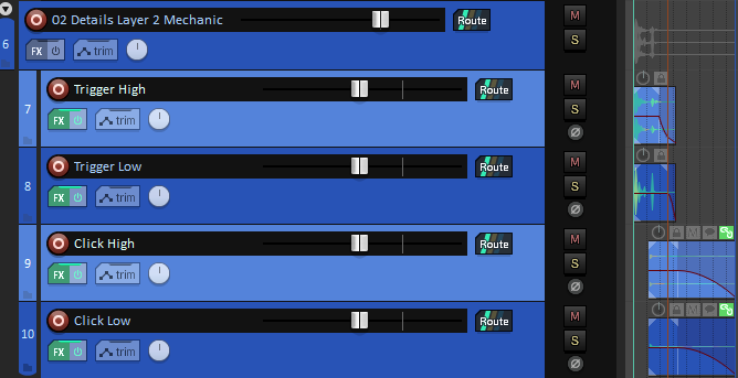 Layer는 서로 결합되어 합성 사운드를 만듭니다. 이 레이어는 네스팅되어(nested) 있기 때문에 해당 트랙으로부터 전체 사운드를 렌더링할 수 있습니다. 모든 Historical Firearms 프로젝트에서 합성 트랙은 Shots라는 이름으로 지정되어 있습니다.