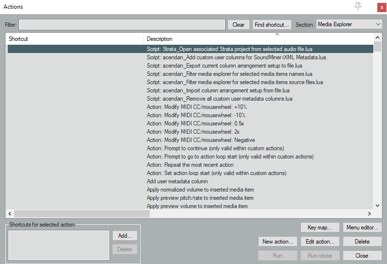 성공적으로 설치되었는지 확인하기 위해 REAPER 메뉴 바에서 Actions > Show actions list를 선택하세요. 스크립트가 Actions 목록의 Media Explorer 섹션에 나타납니다.