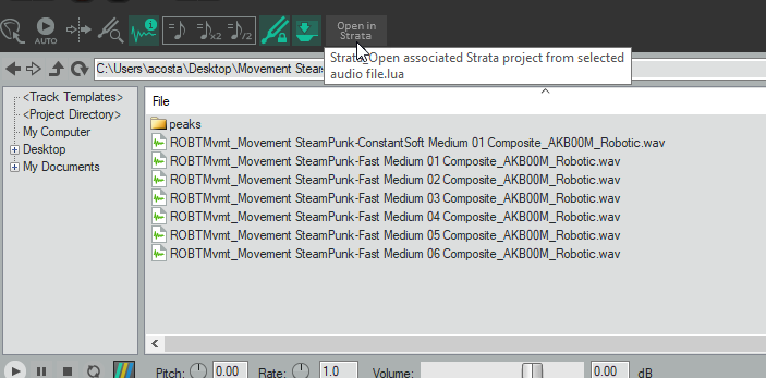 REAPER의 Media Explorer에서 Strata 라이브러리의 렌더를 들어보다가 자신이 원하는 것과 비슷하지만 필요에 맞게 조금 더 변경하고 싶은 경우가 있습니다. 사운드의 메타데이터나 오디오 파일의 경로를 사용하면 사운드가 어떤 하위 프로젝트에 속하는지 알아낼 수 있지만 Strata_Open associated Strata project from selected audio file.lua ReaScript를 사용하면 단 한 번의 클릭만으로 관련 Strata 프로젝트를 열 수 있습니다.