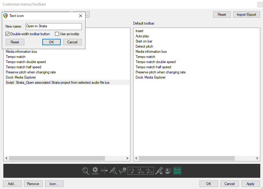 New name: 입력란에 'Open in Strata'를 입력한 후 Double-width toolbar button 체크 상자를 선택하고 OK를 클릭하세요.