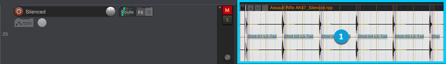 Region/Marker Manager와 타임라인 위에 있는 Region Track에서는 합성 사운드 Shot을 형성하기 위해 결합되는 모든 구역(region)을 볼 수 있습니다. 또한 각 무기의 재장전이나 조작을 위한 특정한 구역이 지정되어 있습니다. 이 구역들은 Foley Composite 트랙에서 렌더링하도록 설정됩니다.