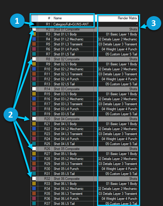렌더링하도록 선택한 구역. 구역 이름 또한 파일 이름의 일부가 됩니다. Region/Marker Manager에서 선택된 구역이 없을 경우 REAPER는 기본적으로 프로젝트에 있는 모든 구역을 렌더링하도록 되어 있습니다. 레이어와 구역에 해당하는 색깔은 타임라인 위에 표시됩니다. |
