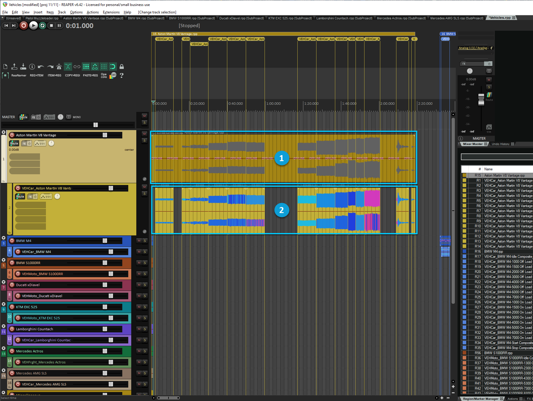 메인 Vehicles 프로젝트는 Vehicles 컬렉션에 있는 사운드를 시각화하고, 찾고, 들어볼 수 있는 간편한 방법을 제공합니다. 뿐만 아니라 컬렉션의 각 하위 프로젝트를 열 수 있는 중심 지점이기도 합니다. 메인 프로젝트는 각 하위 프로젝트 총기에 대한 트랙이 담겨 있으며, 네스팅된 트랙에는 다양한 하위 프로젝트를 참조하는 미디어 항목이 들어 있습니다. 렌더링된 출력을 참조하는 미디어 항목은 해당 하위 프로젝트에서 들어볼 수 있습니다.