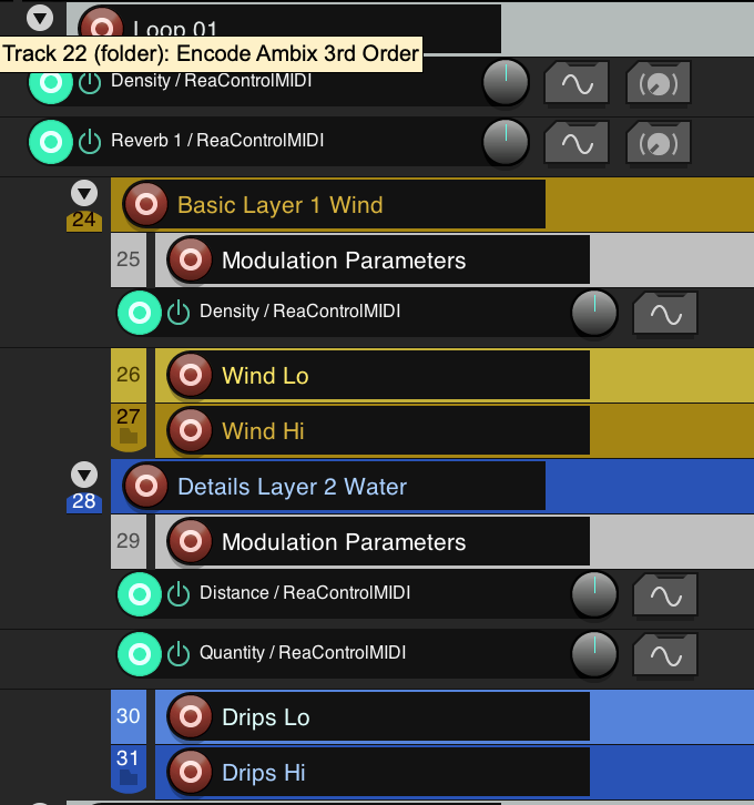 다음 이미지는 Ambisonic Ambience Nature 하위 프로젝트의 트랙을 보여줍니다. 이 프로젝트는 환경음 반복 재생 구간을 형성하는 레이어로 배열되어 있습니다.