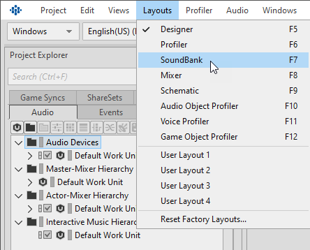 在菜单栏中,依次单击 Layouts > SoundBank(布局 > 音频包)或按下 F7。