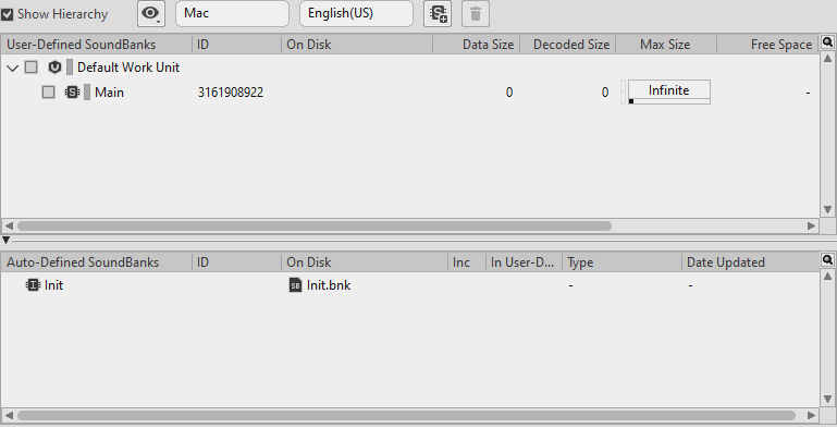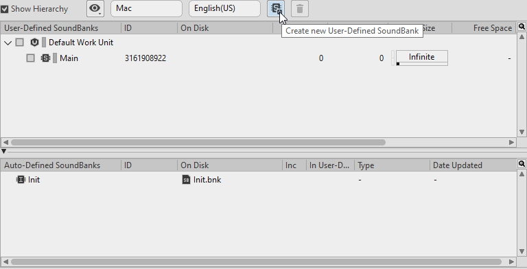 现在可在 SoundBank Manager 中看到刚才创建的 SoundBank 还有 "Main" SoundBank。