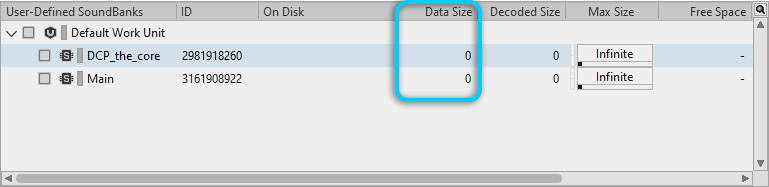 注意,目前 SoundBank 的 Data Size 均为 0。这是因为我们还没有向其添加对象并生成这些 SoundBank。我们将在接下来的练习中完成这些操作。