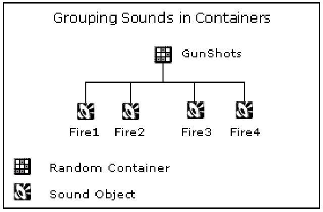 在工程中,容器用来对声音对象分组。它们主要用于根据特定行为(例如随机、顺序、切换等)来播放一组对象。例如,可以将所有枪击声集中到一个随机容器中,以在游戏中每次开枪时播放不同的声音。