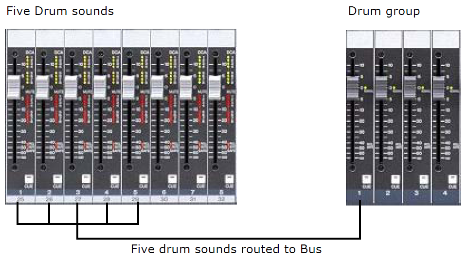 导入工程中的素材是工程层级结构的基础。工程层级结构从传统混音技术演化而来。在传统混音技术中,通过将不同乐器的通路指派到一条总线,您可以将它们的声音属性作为一个混音进行控制。例如,可以将踩镲声、击镲声、碎音钹声、底鼓声和军鼓声的通路全都指派到一条总线,您可以将它们将它们混合后作为一个整体来控制其音量和其他参数。