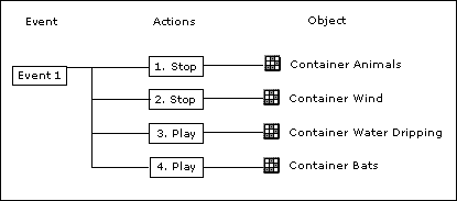 “动作”事件包含包含若干个动作(Action),这些动作会被用于工程层级结构内不同声音、音乐或振动结构。您选择的动作将指定 Wwise 对象是否播放、暂停、停止等。例如,以下事件可能说明一款游戏中的某处,角色离开多风的田野进入神秘洞穴。