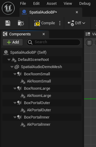 最后还要将 AkGeometry 和 AkLateReverb 组件添加到 Blueprint 类。