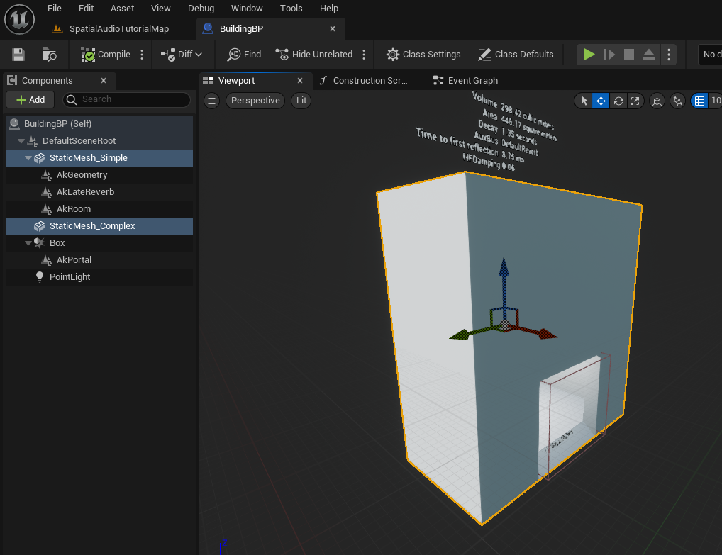 StaticMesh_Simple 组件绑定有 AkRoom 组件和 AkLateReverb 组件。这样的话,会将 "Building_Simple" Mesh 的 Simple Collision 用于对 Room 实施几何包含关系检测。
