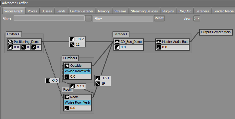 为了更好地模拟来自不同功能(如 Wwise 用户参数、Attenuation、Occlusion 和 Obstruction)的滤波器值,重新设计了声音引擎音频信号网络中的内置低通和高通滤波器。在此之前,Wwise 仅针对声部输出设有唯一一个滤波器,因此要占用此滤波器的多个参数值不得不合并为一个值;最终只使用最小值。Wwise 2017.2 允许针对每个独立输出(包括总线输出)分别设置滤波器,无需再将属于不同射线或输出总线的值进行合并。