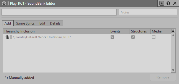 Auto-defined SoundBank 不包含媒体文件,只包含 Structure 和 Event。下图显示了察看 Auto-defined SoundBank Play_RC1 时的 SoundBank Editor 的 Add(添加)和 Edit(编辑)选项卡。Auto-defined SoundBank 的内容无法手动编辑。不过,SoundBank Editor 的各个选项卡会提供有关 Auto-defined SoundBank 的内容和引用的有用信息。