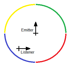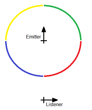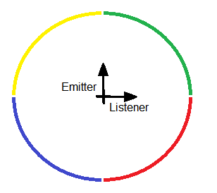 下述发声体朝向的影响仅适用于 3D Spatialization(3D 空间化)设为 Position + Orientation(方向 + 朝向)的情况。在此之后,将讨论如何使用 Position + Orientation 和 Position 这两种3D 空间化模式。