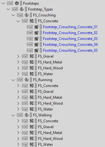 Each of these three footstep types contains another Switch Container that determines the surfaces on which the characters will walk: