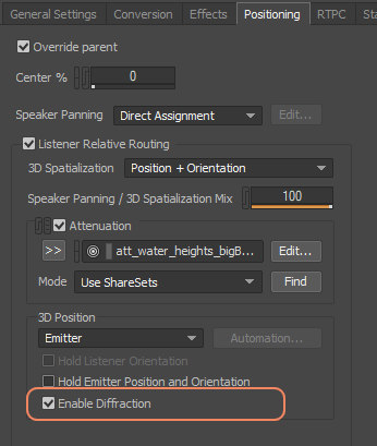 现在可针对特定声音来定义 Spatial Audio 属性,允许用户选择将哪些声音发送到指定的 Aux Bus,并决定是否启用衍射。之前,只能通过游戏编辑器进行配置,而且只能针对特定游戏对象。现在,可以独立于声音层级结构的其他组件来应用和微调 Spatial Audio。