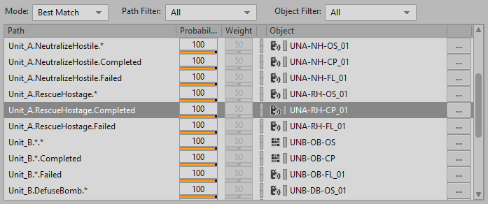 In this game, each time a police officer responds to the player, the game triggers the “Objective_Status” Dialogue Event while setting the actual argument values. Consequently, the object associated with the argument path, either a voice object or a container holding sound objects, is heard. This example doesn’t take advantage of the Probability and Weighting tools, but you can use them in your game to have more control over which piece of audio is played, if any.