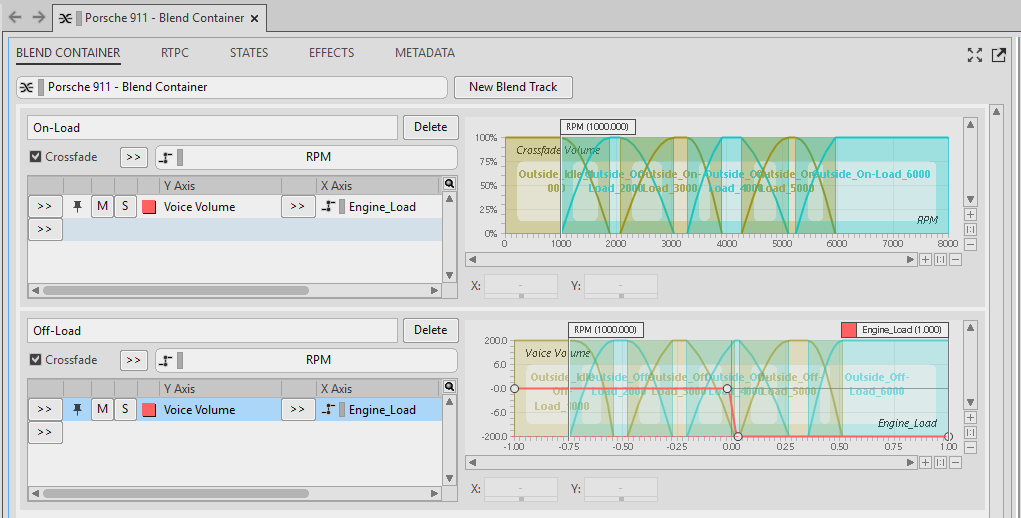 The car engine simulation consists of six looping Sound SFXs revolving at different RPM on-load values (on-load meaning that the gas pedal is pressed) and six other Sound SFXs matching the same RPM off-load (off-load meaning the gas pedal is released). These Sound SFXs were inserted into the Blend Container on two blend tracks named On-Load and Off-Load. A crossfade region was defined between each of these Sound SFXs to ensure a smooth transition between them for when the RPM game parameter changes in real time.
