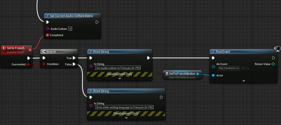 After you map the Unreal Cultures to the Wwise languages, you can use Blueprint nodes to change audio languages and cultures in Unreal. Two Blueprint nodes are available: