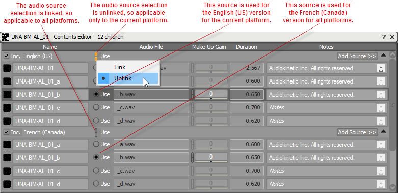在 Wwise 中,对象可以拥有多个源。在默认情况下,当跨平台播放时,对象将使用同一个源。然而,您可以通过在 Contents Editor 中取消链接这些源来为各个平台指定不同的源。在为该平台生成 SoundBank 时,将使用您选择的源。