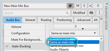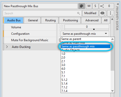 打开与新建 Audio Bus(音频总线)对应的 Property Editor(属性编辑器)。Set Configuration to Same as passthrough mix.
