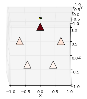 虽然 5.x 扬声器配置的默认角度为 +/-45° 和 +/-135°,但是在本例中我们采用 5.0 配置并将角度设为 +/-72° 和 +/-144°。但它其实可以代表任何其他配置,甚至是 Ambisonics 配置,因为虚声源的分布方位完全相同。