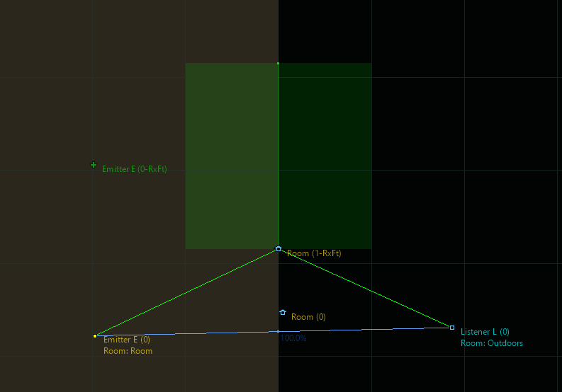 Consider the following scenario, with an emitter, listener, and a single sound propagation path. The emitter has two Room Auxilliary Sends: one to "Outside," the room the emitter is currently in, and one to "Room A," an adjacent room.