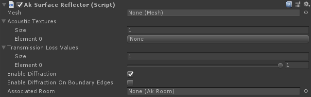 - Associated Room:(已弃用)将此 AkSurfaceReflector 组件与 Room 关联。现已弃用并会在未来版本中移除此属性。建议不要使用该属性(将其保留设为 None)。在将 AkSurfaceReflector 与特定 Room 关联后,会限制几何构造的有效范围。这样可以缩小反射和衍射计算中执行的射线投射的搜索范围。在设为 None 时,会将该几何构造的范围设为全局。注意,一旦将若干几何构造集与某个 Room 关联,那么对于该 Room 内的声音,全局范围的几何构造将不再生效。