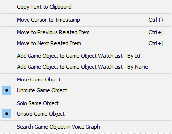 列出所有游戏对象,例如在Advanced Profiler的“Capture Log”一节或“Voices(语音)”一节和“Voices Graph 选项卡”一节选项卡中,有一个特定的快捷菜单,其中包含以下选项: