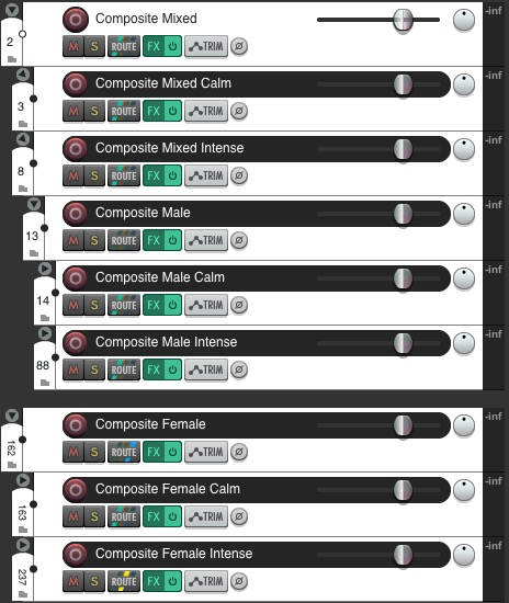 此音轨为 Male Calm 和 Composite Male Intense 音轨的父级 Composite 音轨。该音轨不指派给任何输出。您可以通过同时独奏 Composite Male Calm 和 Composite Male Intense 音轨来试听此 Composite 音轨。